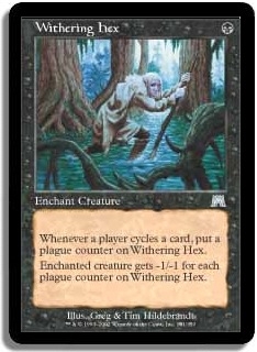 Whenever a player cycles a card, put a plague counter on Withering Hex. Enchanted creature gets -1/-1 for each plague counter on Withering Hex.
