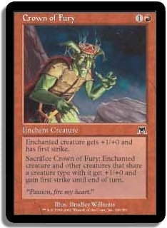 Sacrifice Crown of Fury: Enchanted creature and other creatures that share a creature type with it get +1/+0 and gain first strike until end of turn.