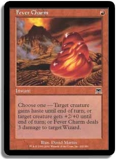 creature gets +2/+0 until end of turn; or Fever Charm deals 3 damage to