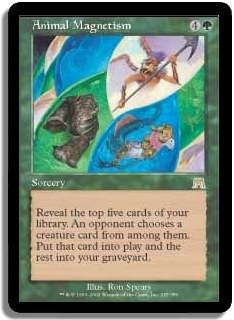 Reveal the top five cards of your library. An opponent chooses a creature card from among them. Put that card into play and the rest into your graveyard.