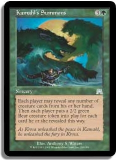Each player may reveal any number of creature cards from his or her hand. Then each player puts a 2/2 green Bear creature token into play for each card he or she revealed this way.