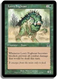 Whenever Leery Fogbeast becomes blocked, prevent all combat damage that would be dealt this turn.