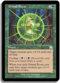 When you cycle Primal Boost, you may have target creature get +1/+1 until end of turn.