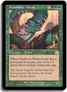 When Symbiotic Wurm is put into a graveyard from play, put seven 1/1 green Insect creature tokens into play.