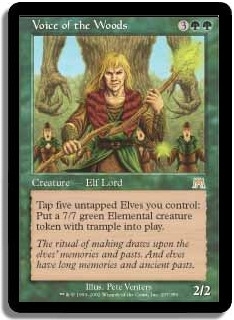 Tap five untapped Elves you control: Put a 7/7 green Elemental creature token with trample into play.