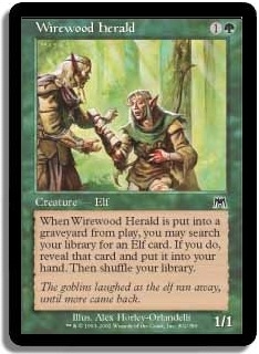 When Wirewood Herald is put into a graveyard from play, you may search your library for an Elf card. If you do, reveal that card and put it into your hand. Then shuffle your library.