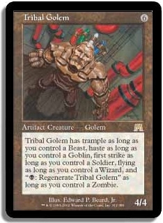 Tribal Golem has trample as long as you control a Beast, haste as long as you control a Goblin, first strike as long as you control a Soldier, flying as long as you control a Wizard, and "B: Regenerate Tribal Golem" as long as you control a Zombie.