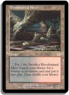 T, Pay 1 life, Sacrifice Bloodstained Mire: Search your library for a swamp or mountain card and put it into play. Then shuffle your library.