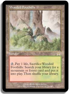 T, Pay 1 life, Sacrifice Wooded Foothills: Search your library for a mountain or forest card and put it into play. Then shuffle your library.