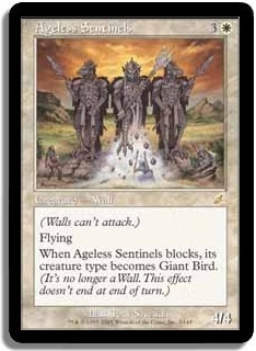 (Walls can't attack.) Flying When Ageless Sentinels blocks, its creature type becomes Giant Bird. (It's no longer a Wall. This effect doesn't end at end of turn.)