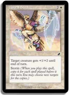 Target creature gets +1/+2 until end of turn. Storm (When you play this spell, copy it for each spell played before it this turn. You may choose new targets for the copies.)