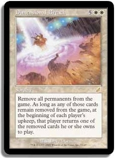 Remove all permanents from the game. As long as any of those cards remain removed from the game, at the beginning of each player's upkeep, that player returns one of the removed cards he or she owns to play.