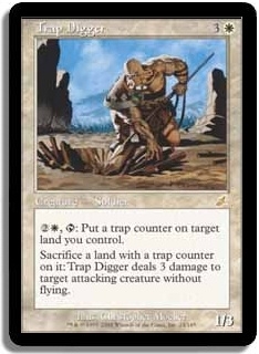 2W, Tap: Put a trap counter on target land you control. Sacrifice a land with a trap counter on it: Trap Digger deals 3 damage to target attacking creature without flying.