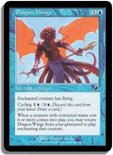 Enchanted creature has flying. Cycling 1U (1U, Discard this card from your hand: Draw a card.) When a creature with converted mana cost 6 or more comes into play, you may return Dragon Wings from your graveyard to play enchanting that creature.