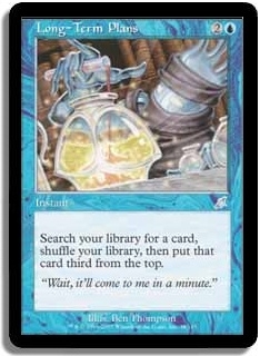 Search your library for a card, shuffle your library, then put that card third from the top.
