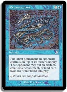 Put target permanent an opponent controls on top of its owner's library. That opponent may put an artifact, creature, enchantment, or land card from his or her hand into play.