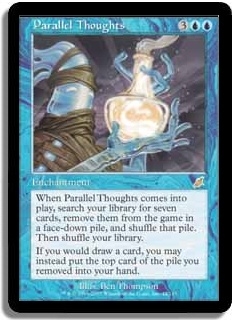 When Parallel Thoughts comes into play, search your library for seven cards, remove them from the game in a face-down pile, and shuffle that pile. Then shuffle your library. If you would draw a card, you may instead put the top card of the pile you removed into your hand.