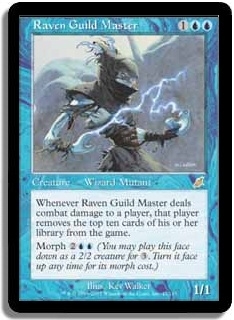 Whenever Raven Guild Master deals combat damage to a player, that player removes the top ten cards of his or her library from the game. Morph 2UU (You may play this face down as a 2/2 creature for 3. Turn it face up any time for its morph cost.)