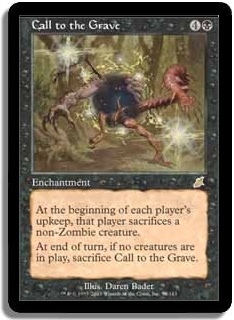 At the beginning of each player's upkeep, that player sacrifices a non-Zombie creature. At end of turn, if no creatures are in play, sacrifice Call to the Grave.