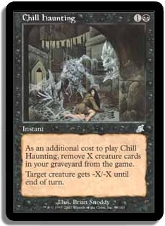 As an additional cost to play Chill Haunting, remove X creature cards in your graveyard from the game. Target creature gets -X/-X until end of turn.