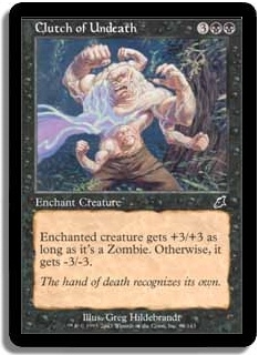 Enchanted creature gets +3/+3 as long as it's a Zombie. Otherwise, it gets -3/-3.