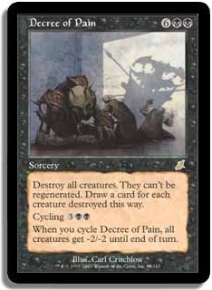Destroy all creatures. They can't be regenerated. Draw a card for each creature destroyed this way. Cycling 3BB When you cycle Decree of Pain, all creatures get -2/-2 until end of turn.