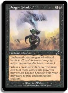 Enchanted creature gets +1/+0 and has fear. (It can't be blocked except by artifact creatures and/or black creatures.) When a creature with converted mana cost 6 or more comes into play, you may return Dragon Shadow from your graveyard to play enchanting that creature.