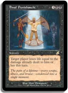 Target player loses life equal to the damage already dealt to him or her this turn.