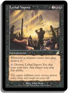 Whenever a creature comes into play, destroy it. : Destroy Lethal Vapors. You skip your next turn. Any player may play this ability.
