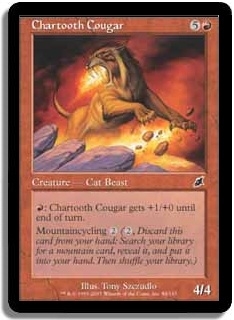 R: Chartooth Cougar gets +1/+0 until end of turn. Mountaincycling 2 (2, Discard this card from your hand: Search your library for a mountain card, reveal it, and put it into your hand. Then shuffle your library.)