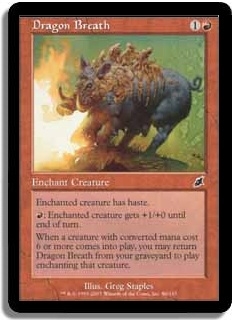 Enchanted creature has haste. oR Enchanted creature gets +1/+0 until end of turn. When a creature with converted mana cost 6 or more comes into play, you may return Dragon Breath from your graveyard to play enchanting that creature.