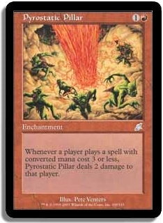 Whenever a player plays a spell with converted mana cost 3 or less, Pyrostatic Pillar deals 2 damage to that player.