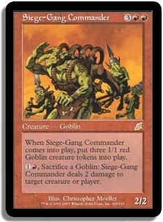 When Siege-Gang Commander comes into play, put three 1/1 red Goblin creature tokens into play. 1R, Sacrifice a Goblin: Siege-Gang Commander deals 2 damage to target creature or player.