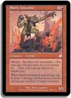 Morph-Sacrifice two mountains. (You may play this face down as a 2/2 creature for 3. Turn it face up any time for its morph cost.) When Skirk Volcanist is turned face up, it deals 3 damage divided as you choose among any number of target creatures.