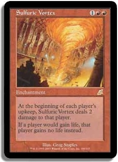 At the beginning of each player's upkeep, Sulfuric Vortex deals 2 damage to that player. If a player would gain life, that player gains no life instead.