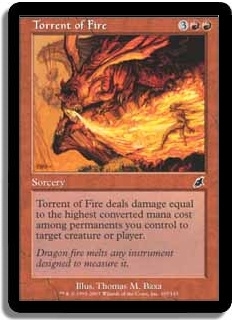 Torrent of Fire deals damage equal to the highest converted mana cost among permanents you control to target creature or player.