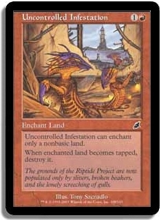 Uncontrolled Infestation can enchant only a nonbasic land. When enchanted land becomes tapped, destroy it.