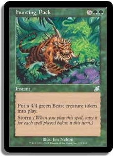 Put a 4/4 green Beast creature token into play. Storm (When you play this spell, copy it for each spell played before it this turn.)