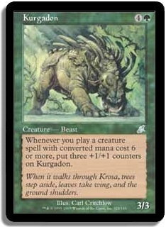 Whenever you play a creature spell with converted mana cost 6 or more, put three +1/+1 counters on Kurgadon.