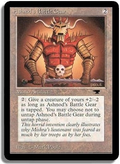 <2>: Give a creature of yours +2/-2 as long as Ashnod's Battle Gear remains tapped. You may choose not to untap Ashnod's Battle Gear during untap phase.