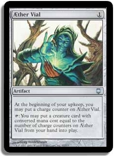 At the beginning of your upkeep, you may put a charge counter on Aether Vial. T: You may put a creature card with converted mana cost equal to the number of charge counters on Aether Vial from your hand into play.