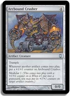 Trample Whenever another artifact comes into play, put a +1/+1 counter on Arcbound Crusher. Modular 1 (This comes into play with a +1/+1 counter on it. When it's put into a graveyard, you may put its +1/+1 counters on target artifact creature.)