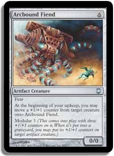 Fear At the beginning of your upkeep, you may move a +1/+1 counter from target creature onto Arcbound Fiend. Modular 3 (This comes into play with three +1/+1 counters on it. When it's put into a graveyard, you may put its +1/+1 counters on target artifact creature.)