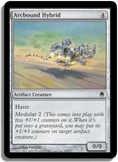 Haste Modular 2 (This comes into play with two +1/+1 counters on it. When it's put into a graveyard, you may put its +1/+1 counters on target artifact creature.)