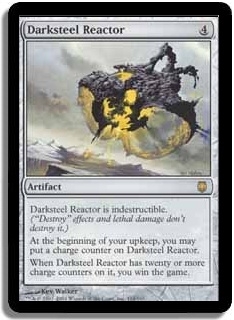 Darksteel Reactor is indestructible. ("Destroy" effects and lethal damage don't destroy it.) At the beginning of your upkeep, you may put a charge counter on Darksteel Reactor. When Darksteel Reactor has twenty or more charge counters on it, you win the game.