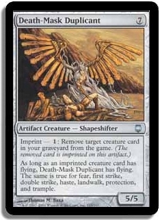 Imprint - 1: Remove target creature card in your graveyard from the game. (The removed card is imprinted on this artifact.) As long as an imprinted creature card has flying, Death-Mask Duplicant has flying. The same is true for fear, first strike, double strike, haste, landwalk, protection, and trample.