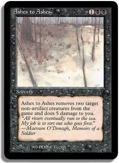 Ashes to Ashes removes two target non-artifact creatures from the game and deals 5 damage to you.