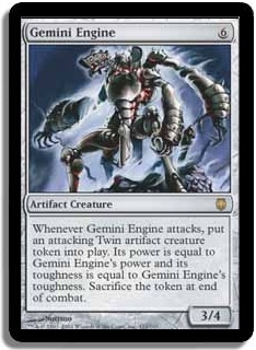 Whenever Gemini Engine attacks, put an attacking Twin artifact creature token into play. Its power is equal to Gemini Engine's power and its toughness is equal to Gemini Engine's toughness. Sacrifice the token at end of combat.