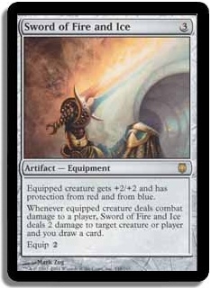 Equipped creature gets +2/+2 and has protection from red and from blue. Whenever equipped creature deals combat damage to a player, Sword of Fire and Ice deals 2 damage to target creature or player and you draw a card. Equip 2