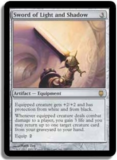 Equipped creature gets +2/+2 and has protection from white and from black. Whenever equipped creature deals combat damage to a player, you gain 3 life and you may return up to one target creature card from your graveyard to your hand. Equip 2